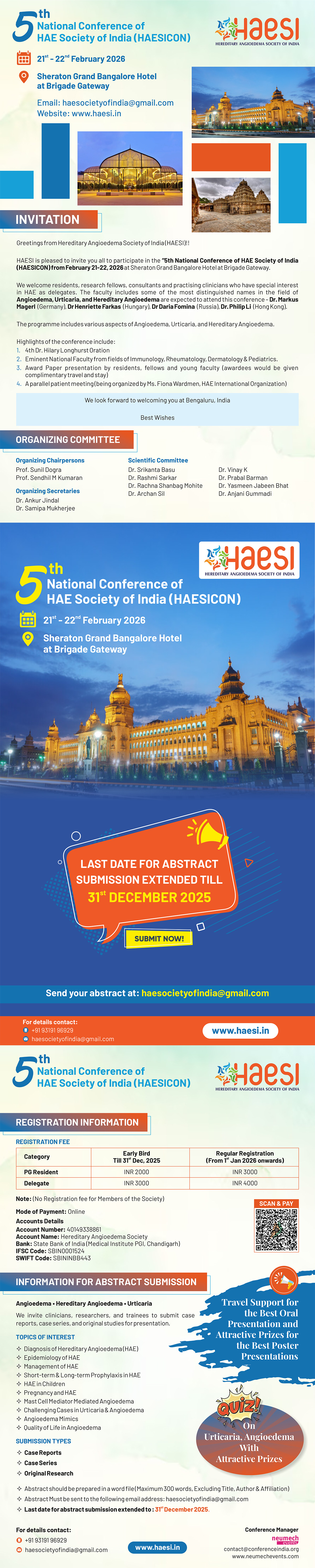 Hereditary angioedema (HAE) is an uncommon disease characterized by recurrent episodes of ill-defined, non-pitting, deep seated skin and mucosal swellings. Skin swellings most frequently involve the limbs followed by face, genitals and lips. In addition, patients may experience recurrent episodes of abdominal pain. Laryngeal edema is a potentially life-threatening manifestation of HAE.